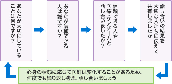 - 心身の状態に応じて意思は変化することがあるため、何度でも繰り返し考え話し合いましょう。