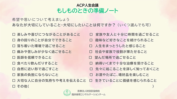 当院ではACP「もしものときの準備ノート」をお渡ししています。